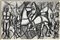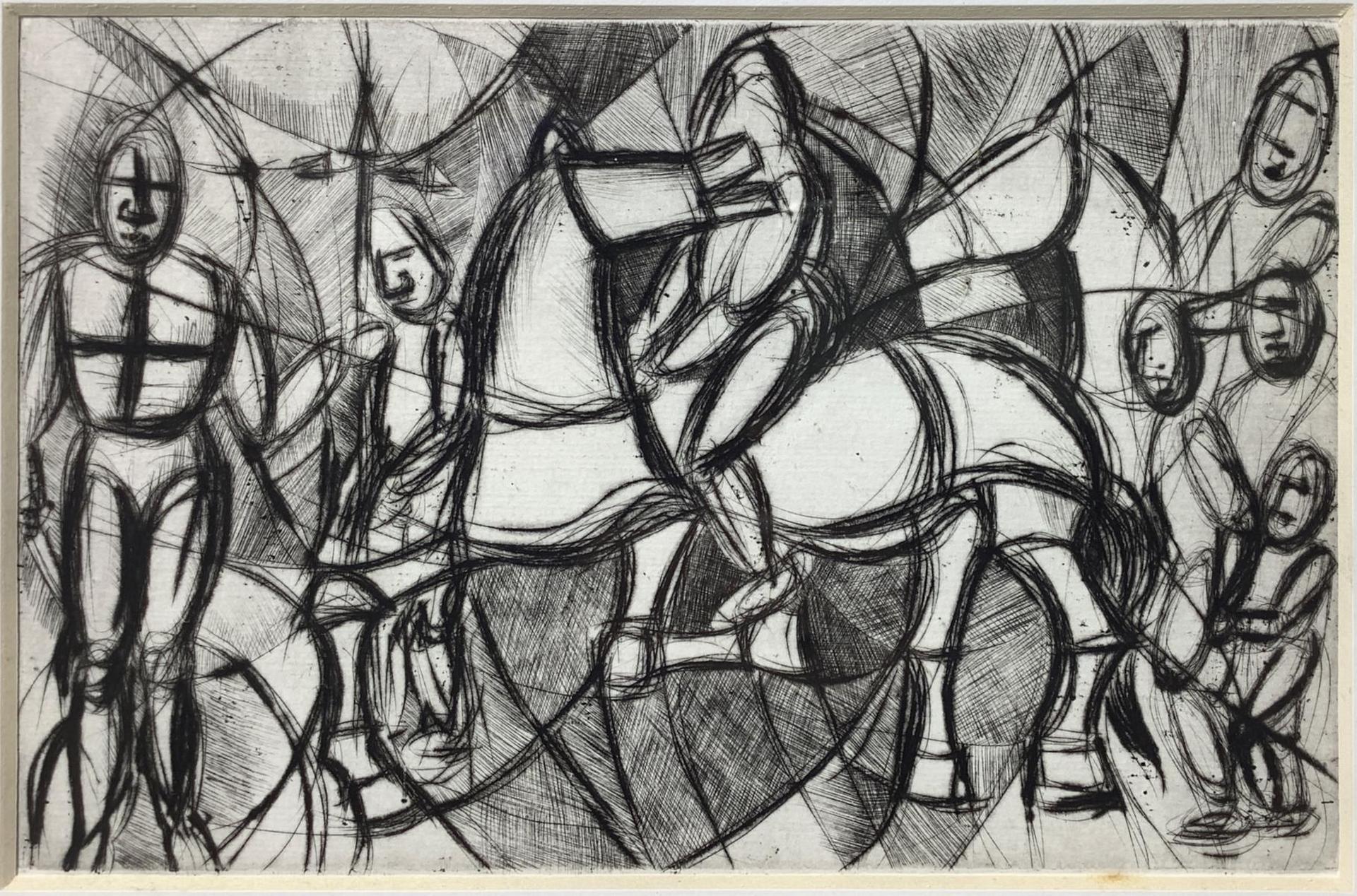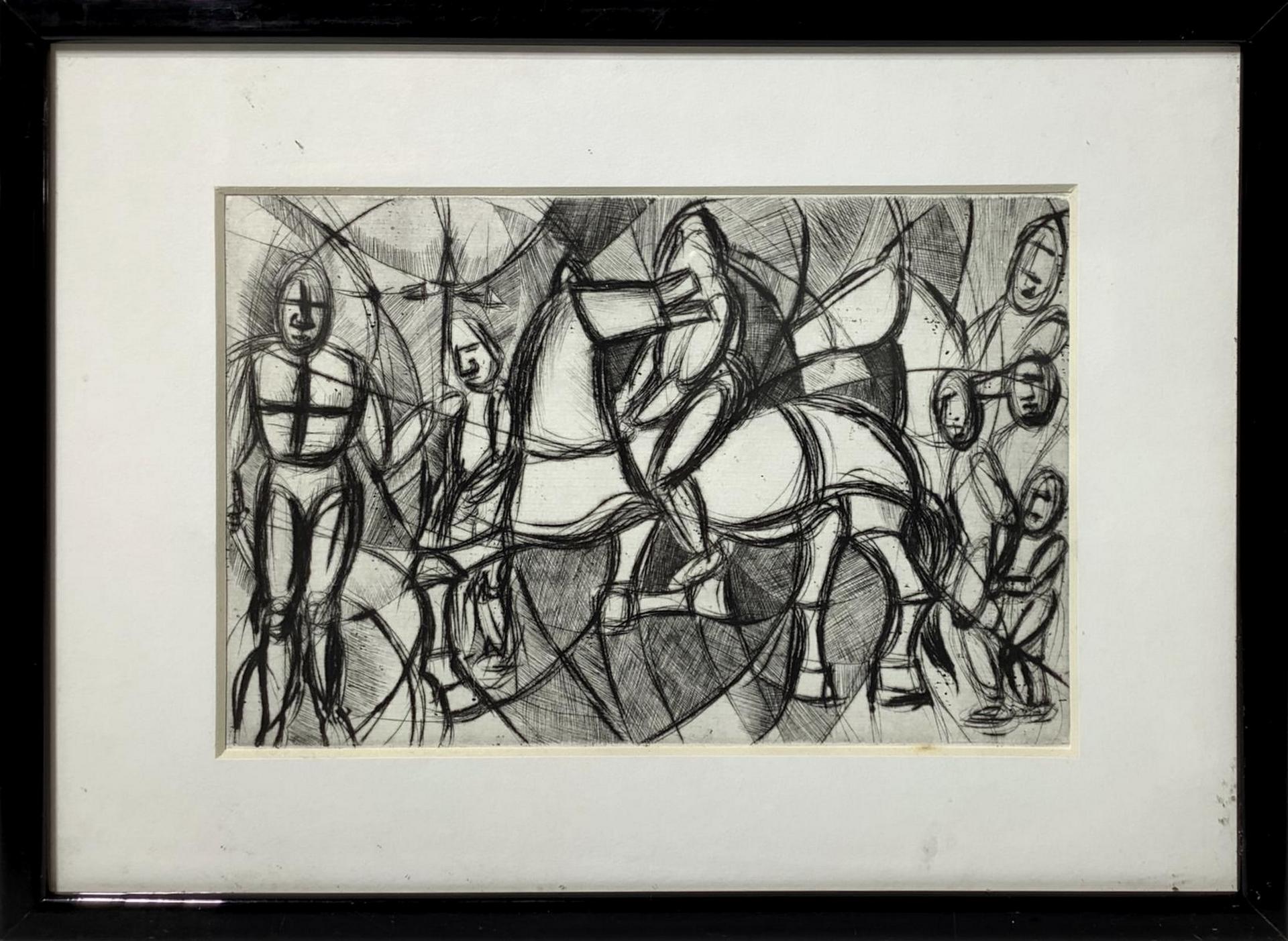 Incisione ad acquaforte raffigurante cavalieri crociati a cavallo. Mm 160x240, in cornice cm 27x36