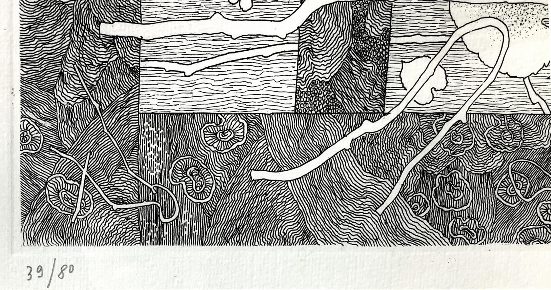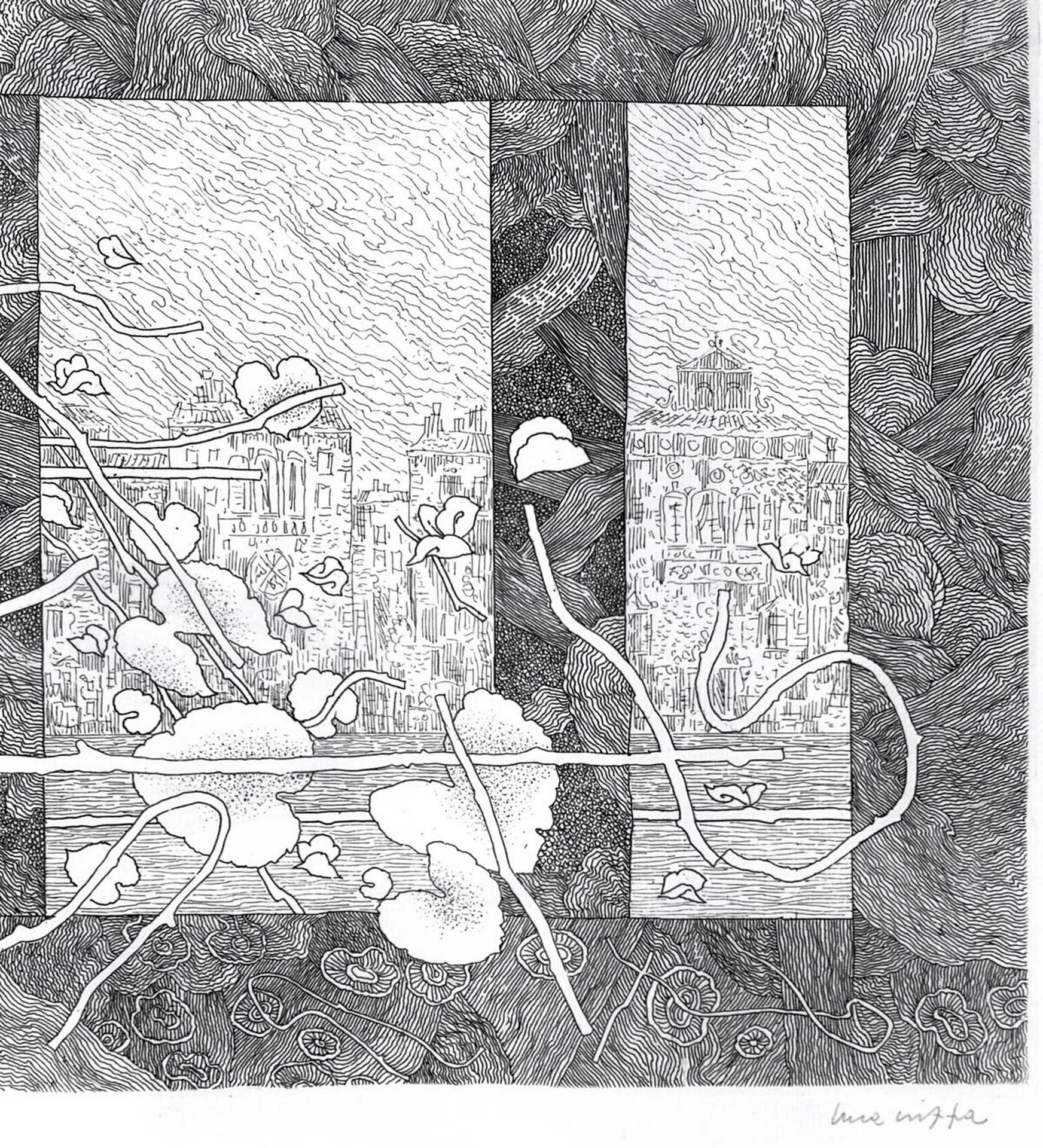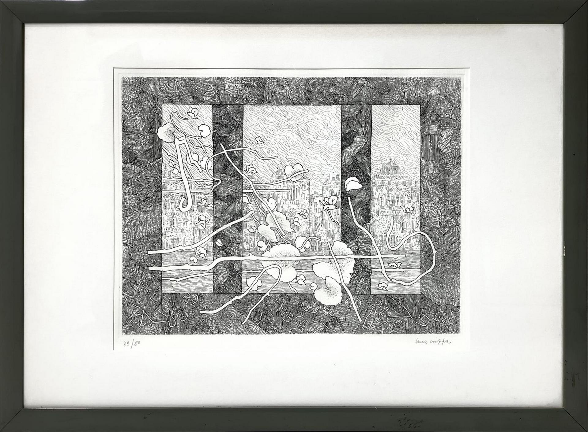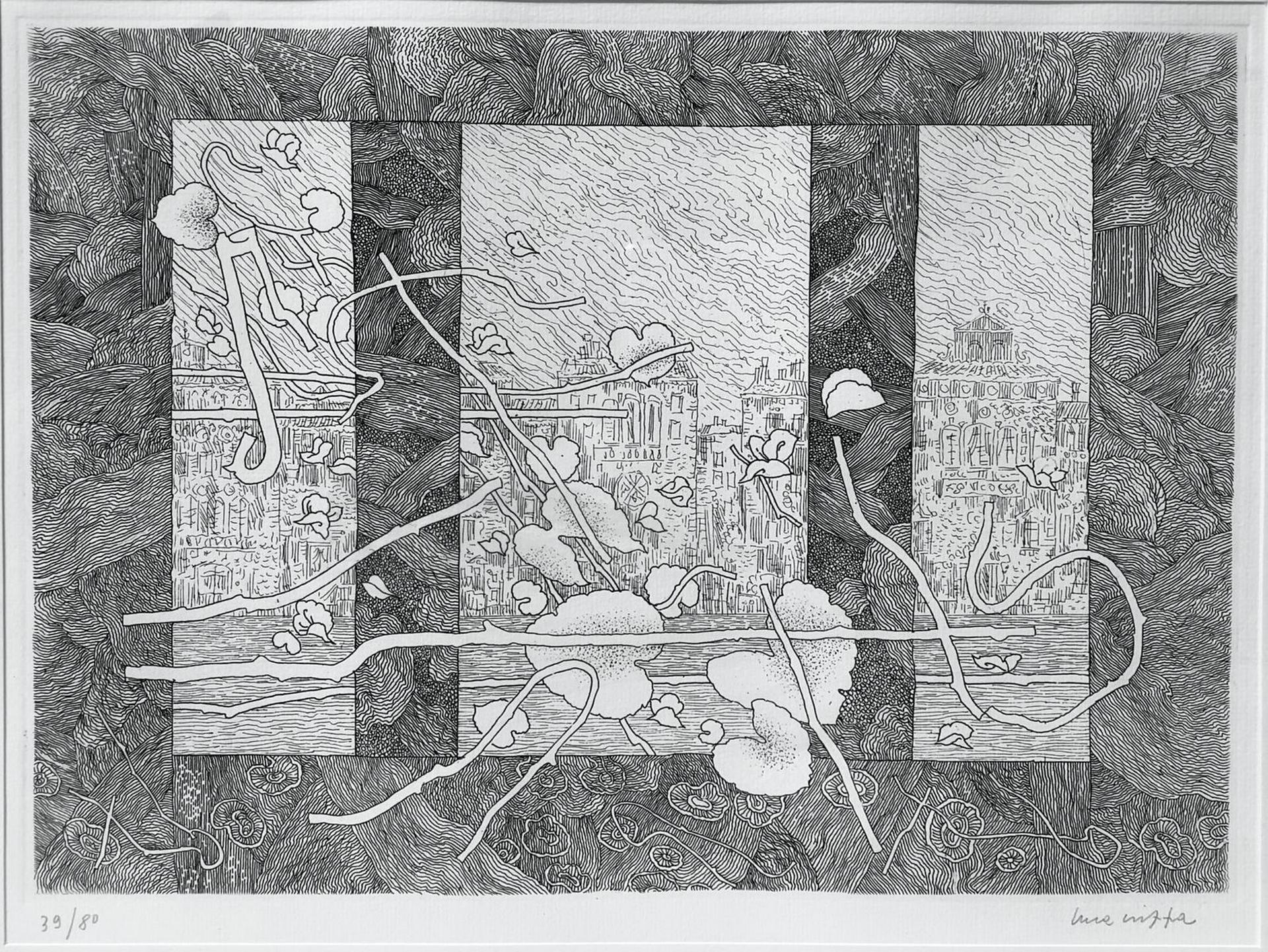 Incisione ad acquaforte raffigurante scorci di città all’interno di figure geometriche, 39/80. Firmato in basso a destra Luca M. Mm 255x325, in cornice cm 40x53