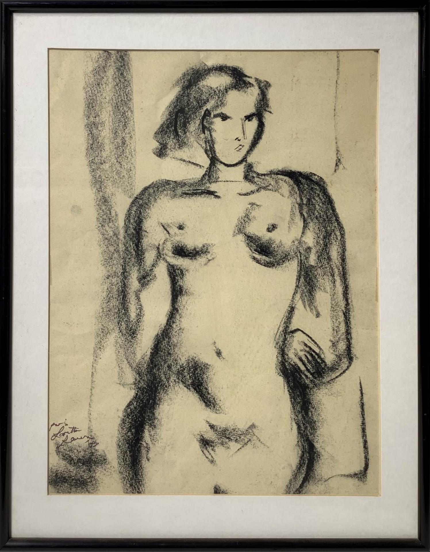 Disegno a carboncino raffigurante nudo di donna, firmato in basso a sinistra Loretta R. Mm 380x290, in cornice cm 47x38