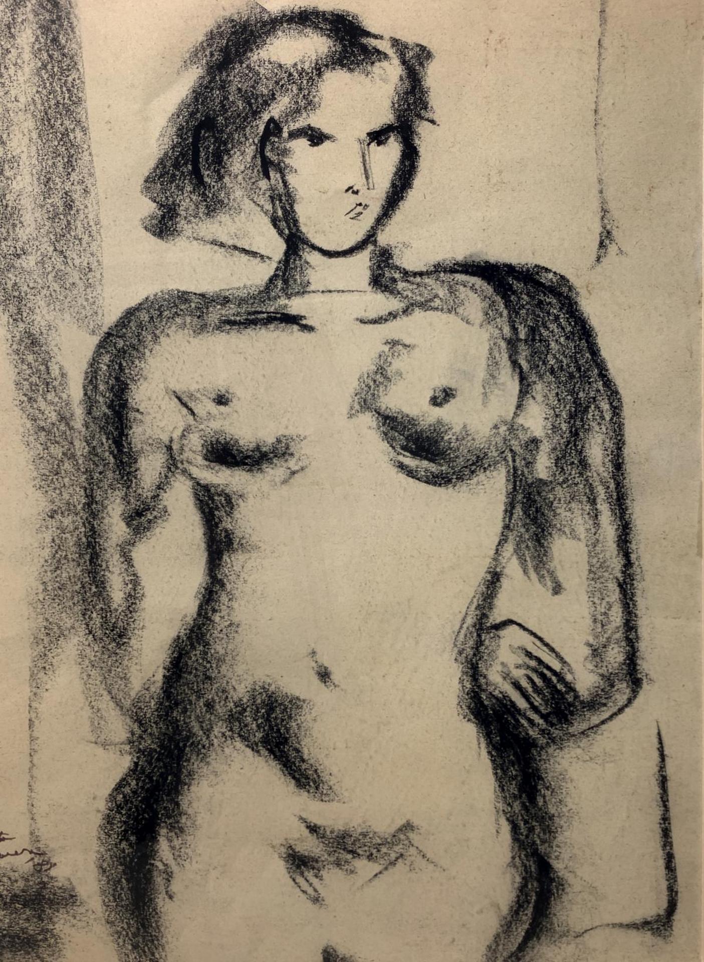 Disegno a carboncino raffigurante nudo di donna, firmato in basso a sinistra...