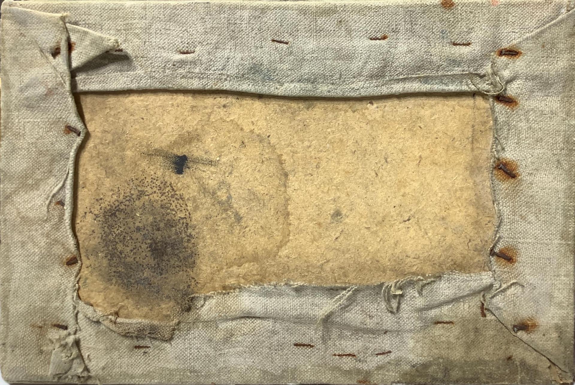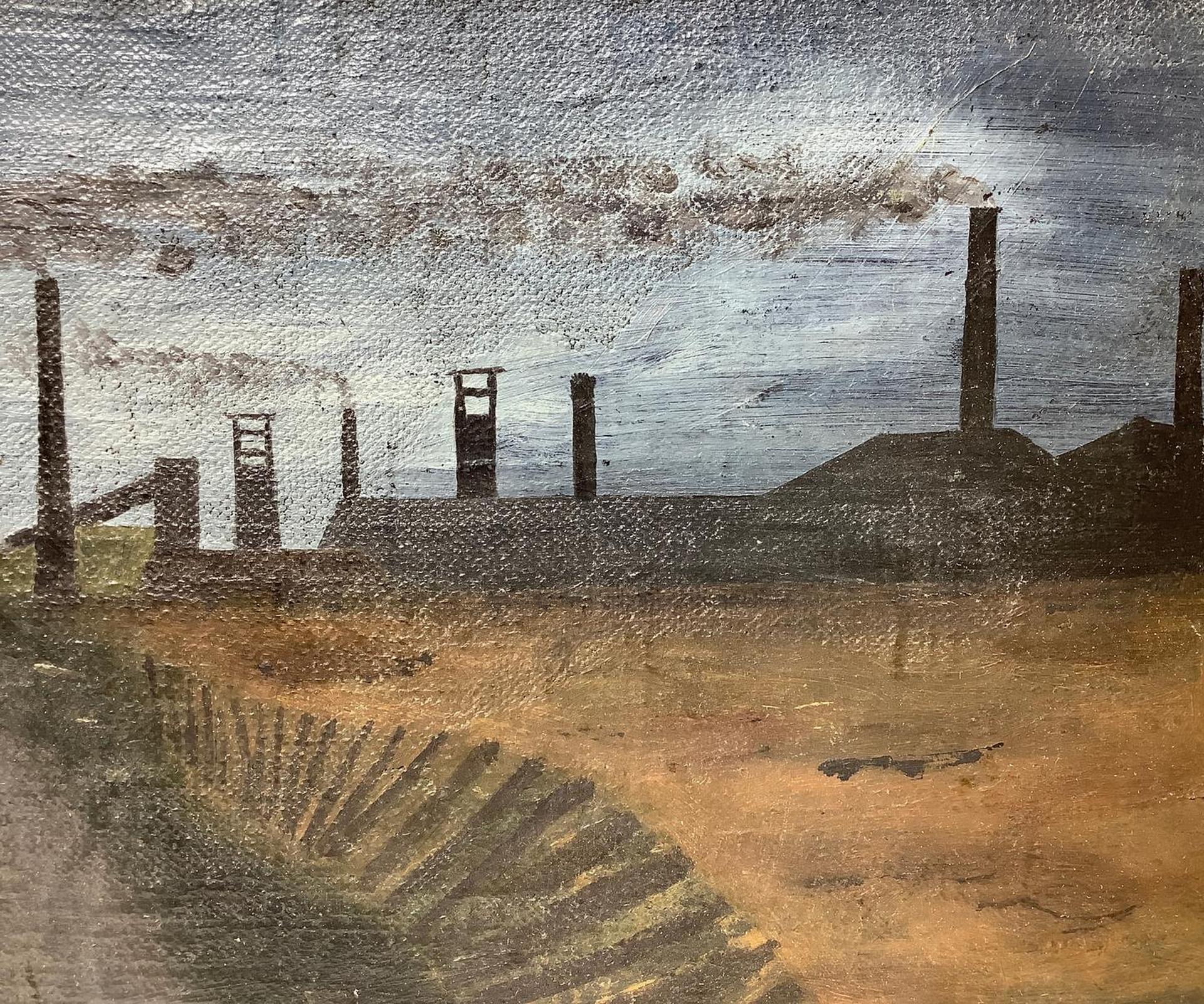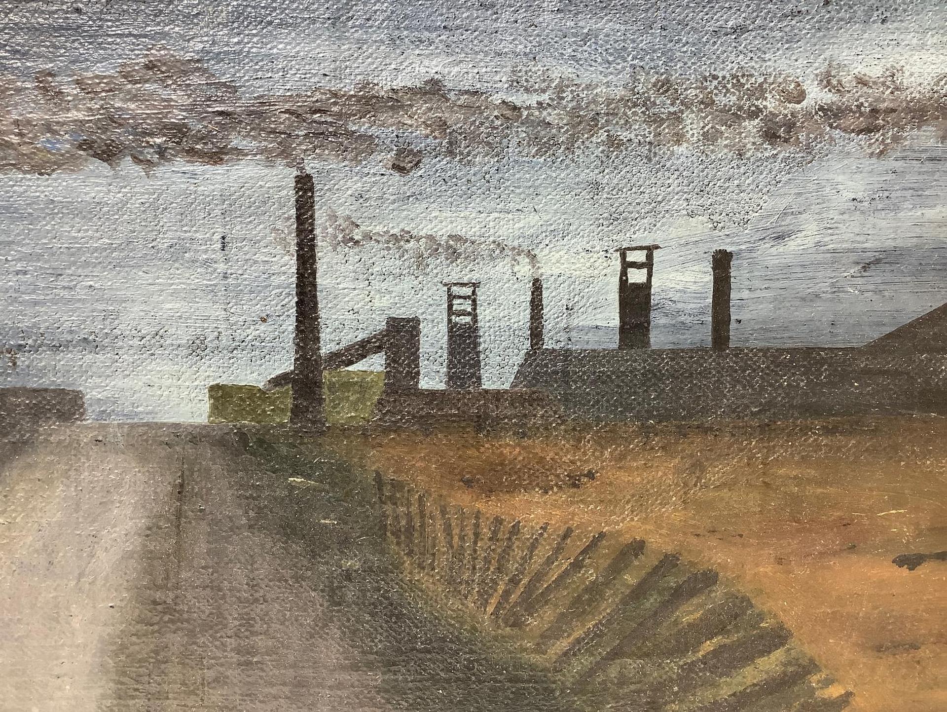 Dipinto ad olio su tela applicata su tavola raffigurante paesaggio industriale, pittore italiano inizio del XX secolo. Cm 35x24