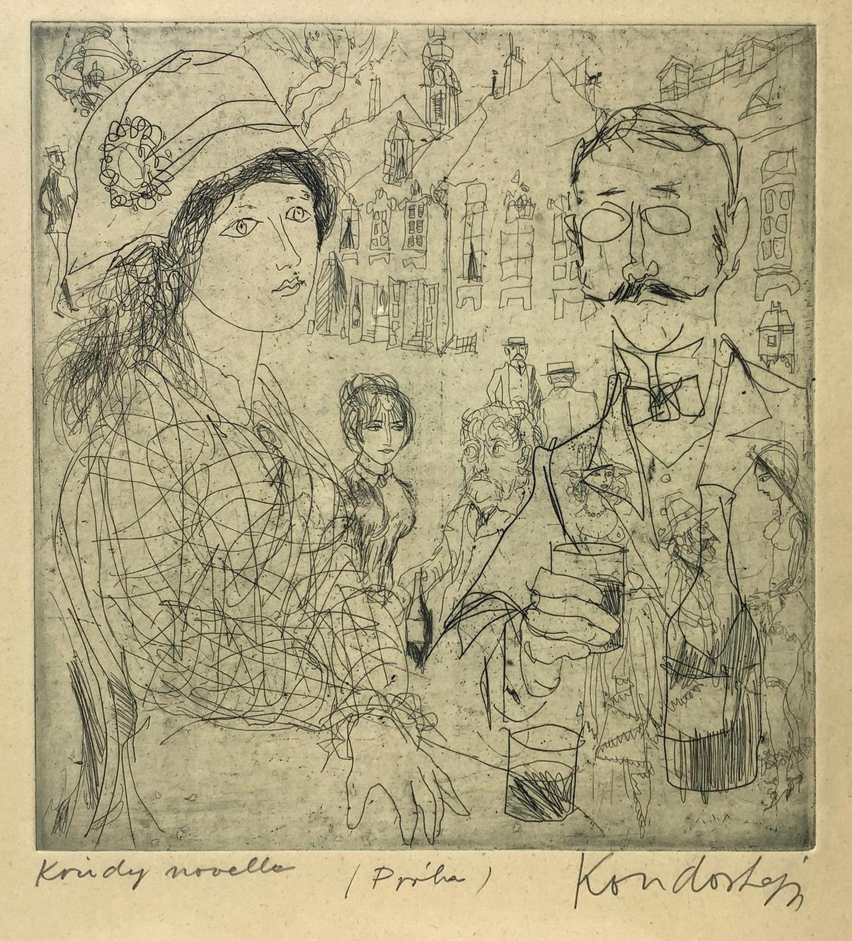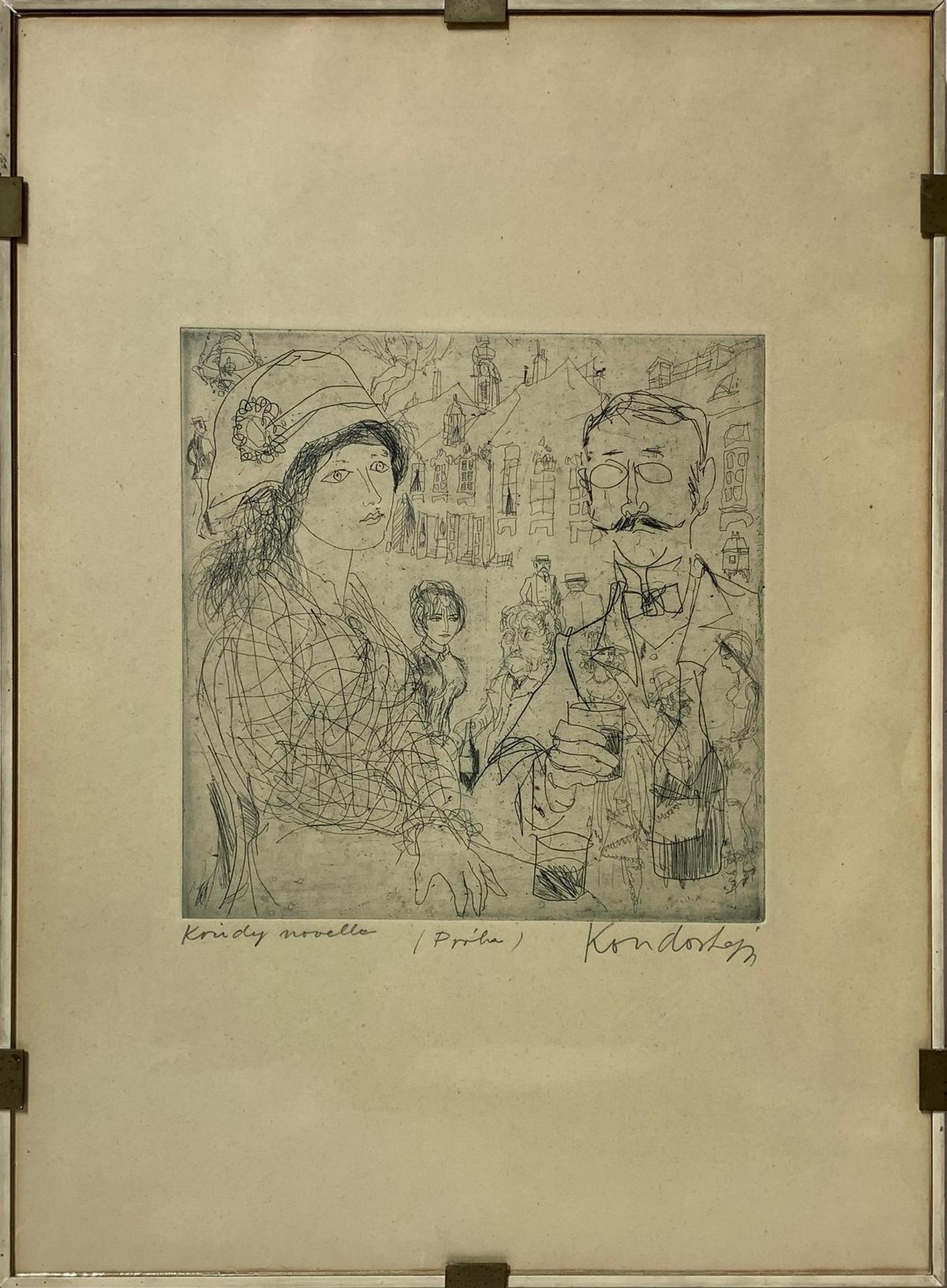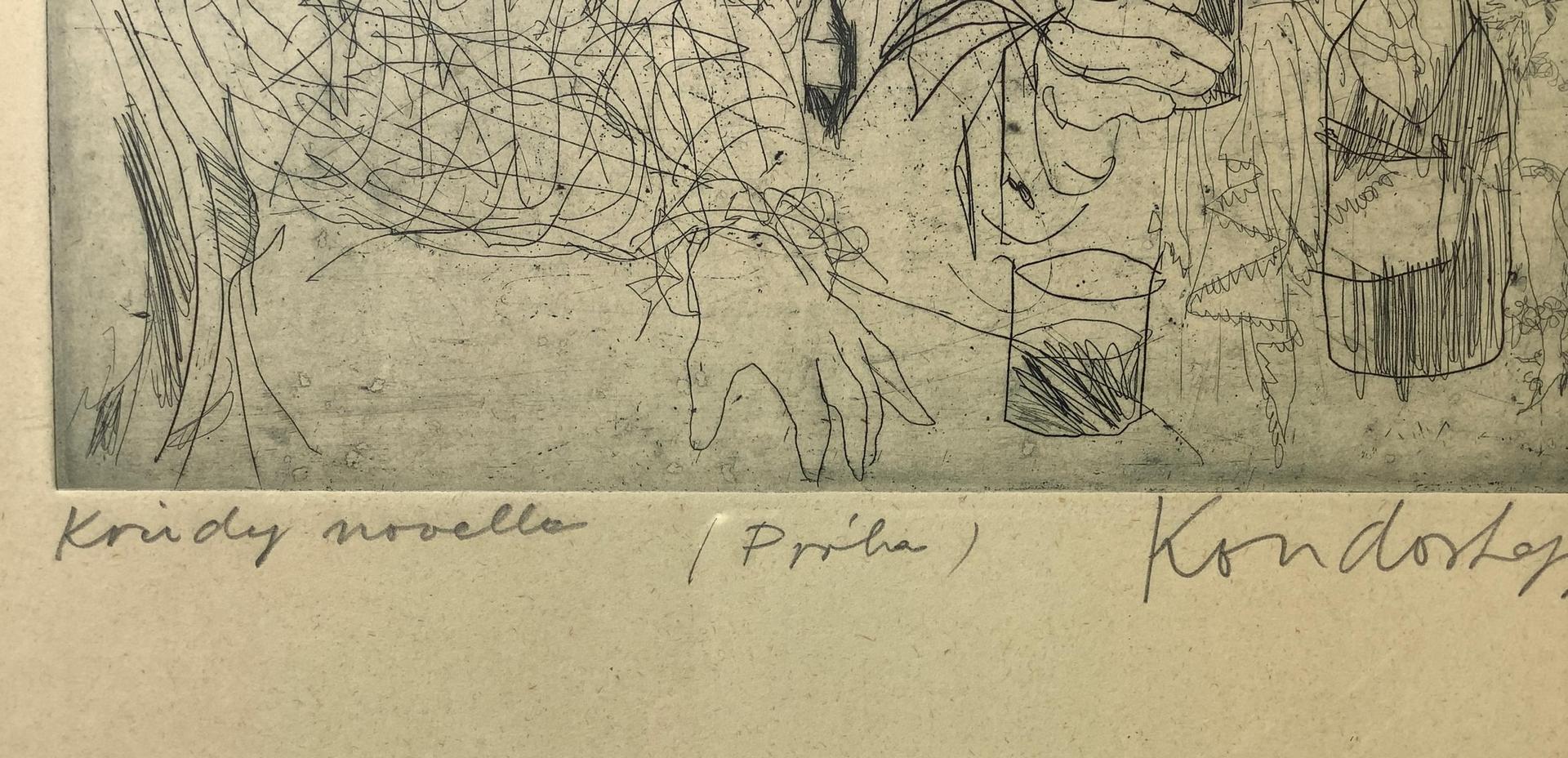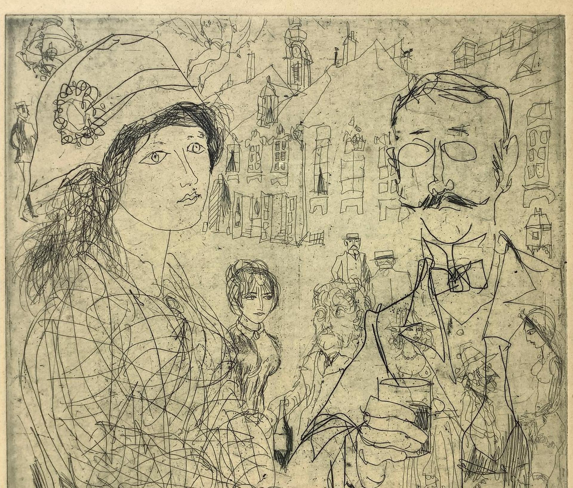 Incisione raffigurante Kandinsky e figura femminile, firmato al centro Priha,...