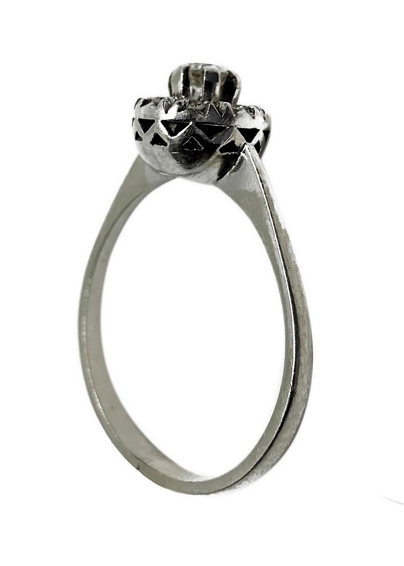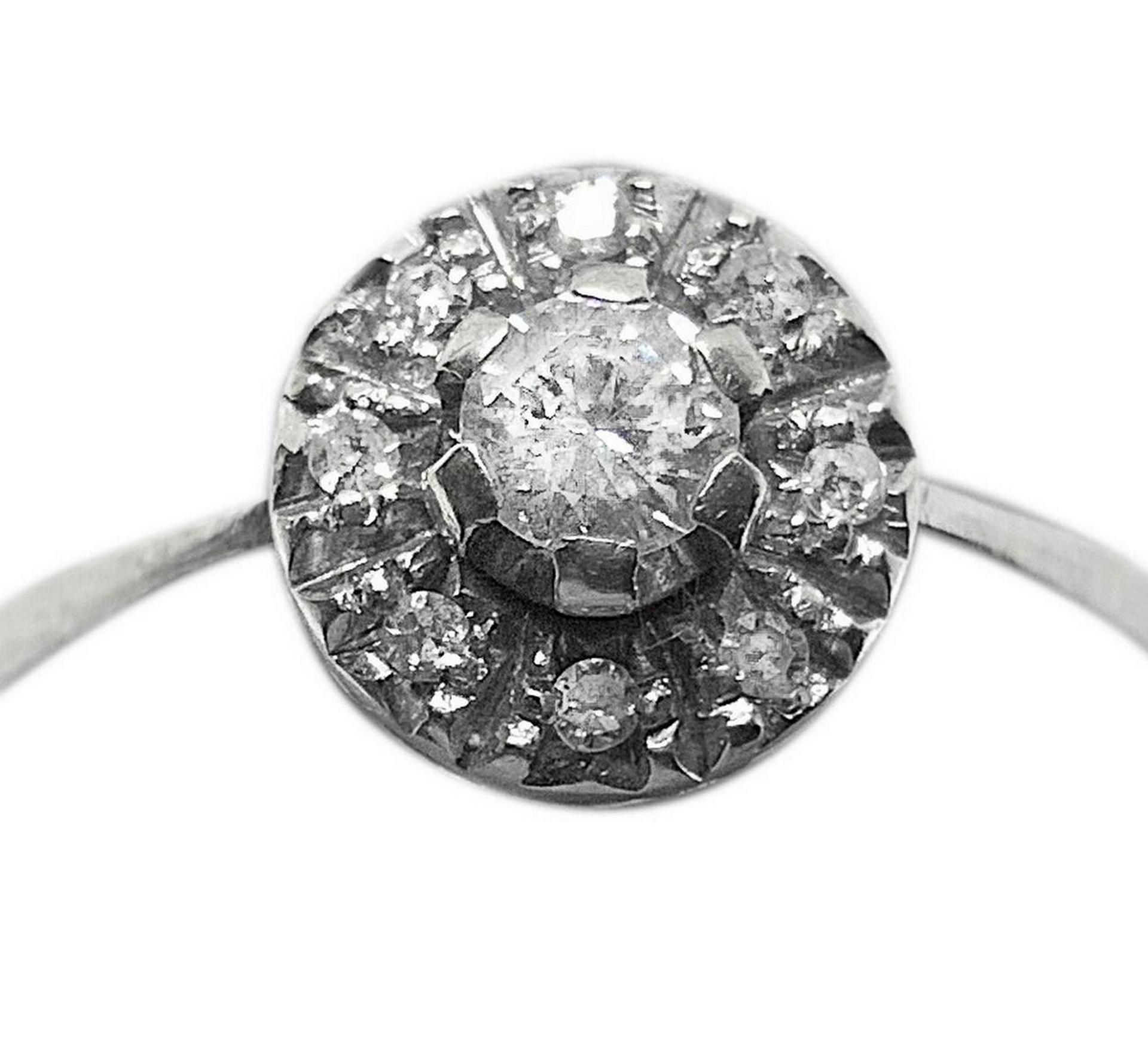 Anello a rosetta in oro bianco con brillante al centro e giro di brillanti. Gr 3.3