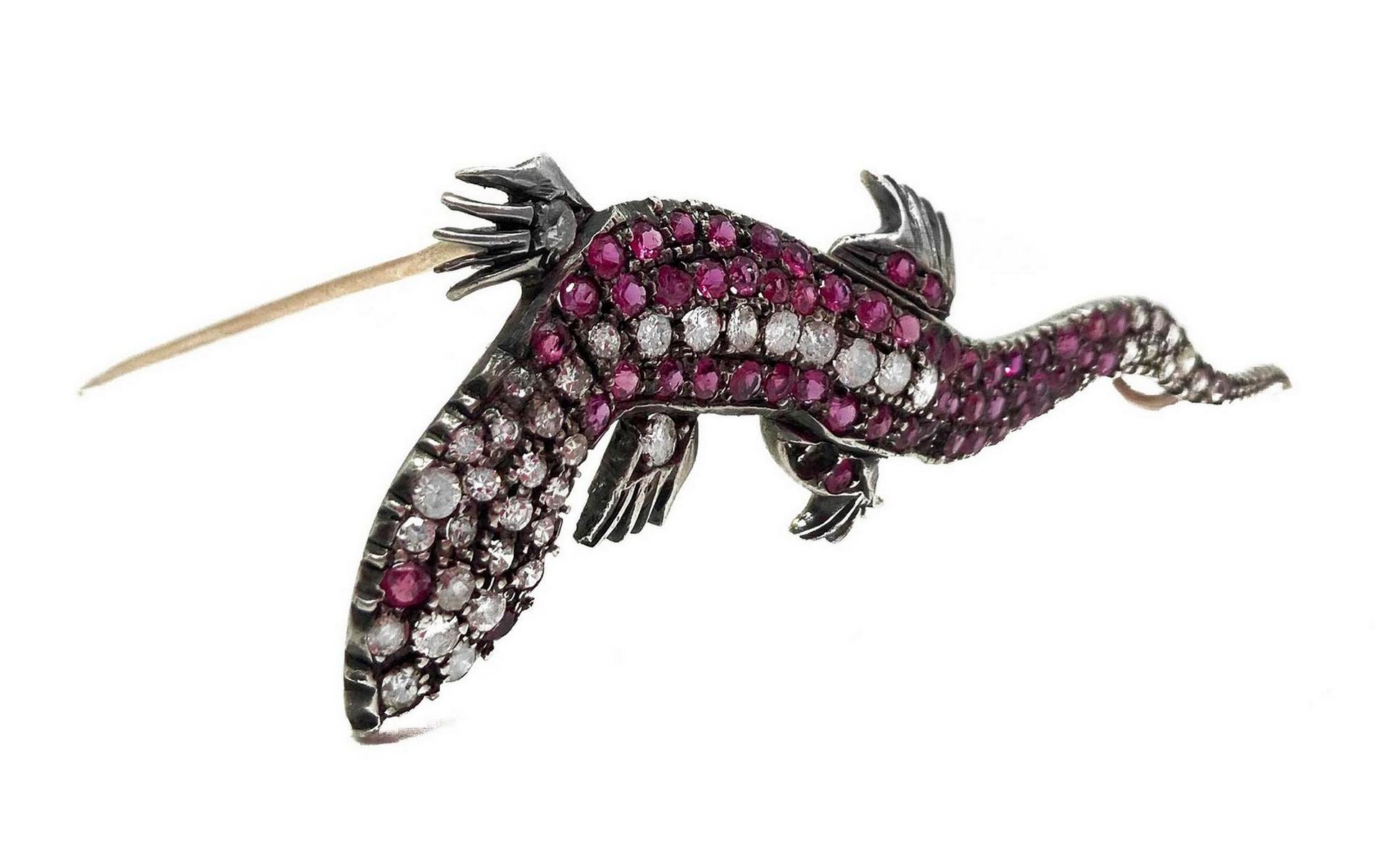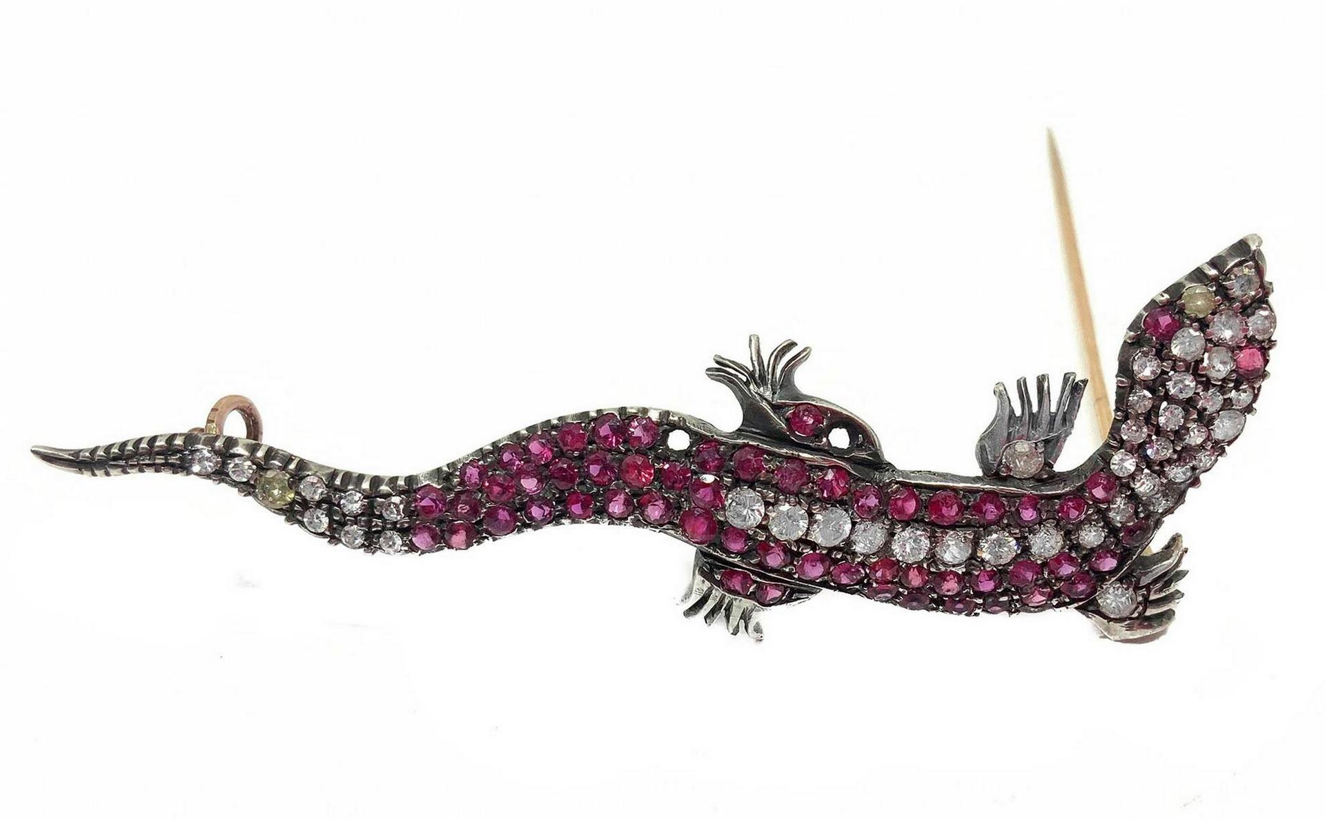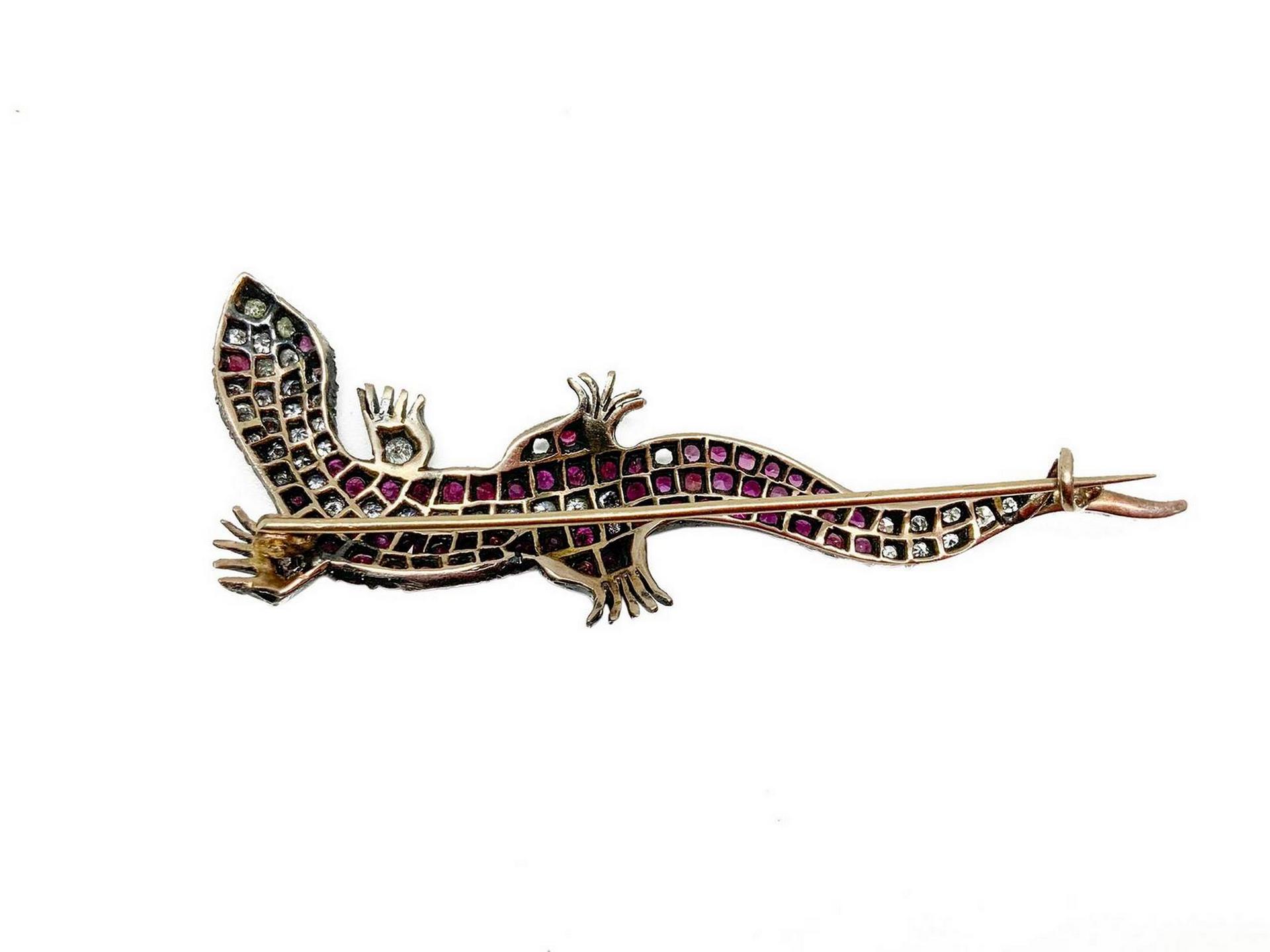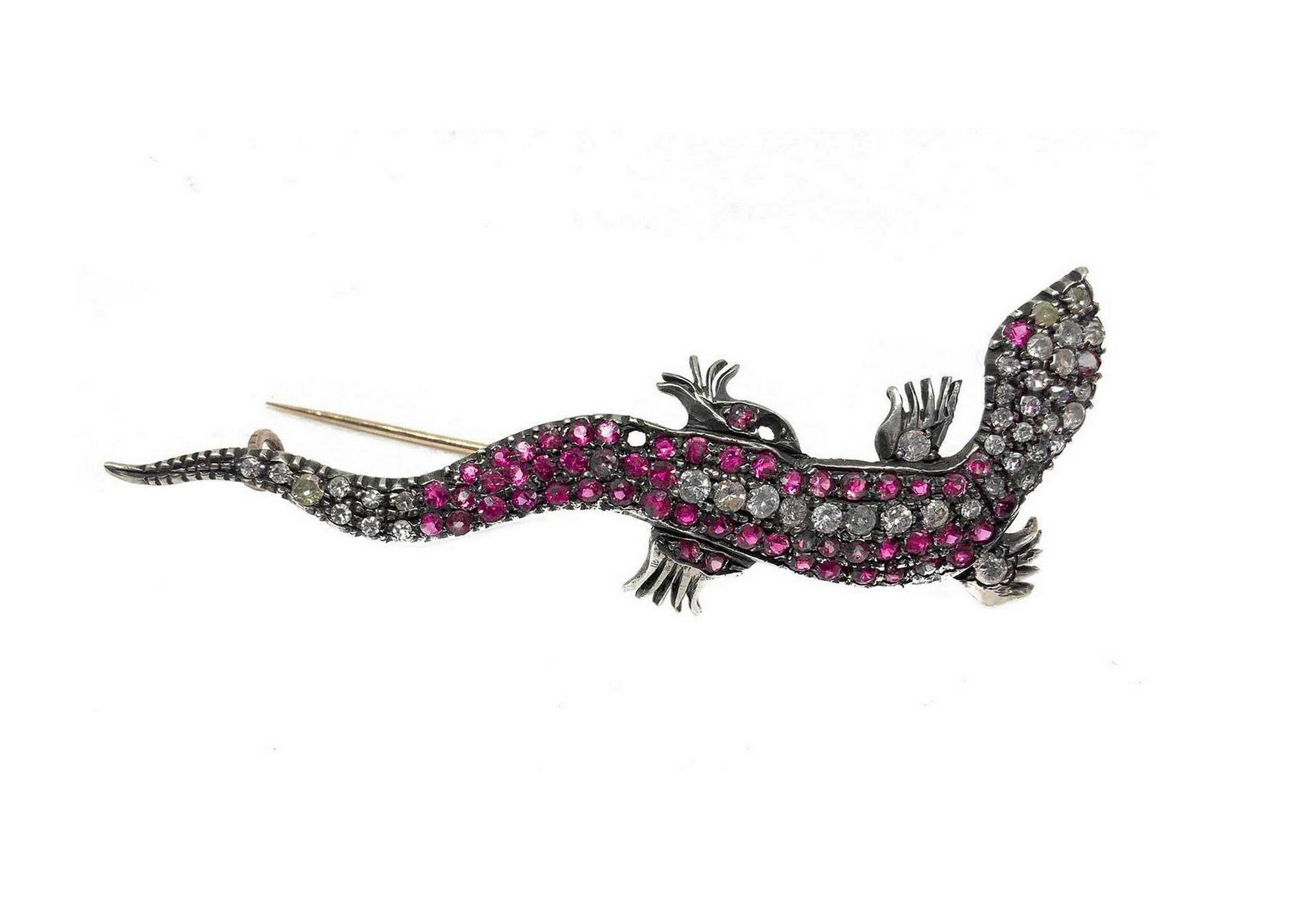 Spilla in oro 8 K e argento a forma di lucertola con diamanti taglio Whit Whit (16 faccette) e rubini. Gr 8