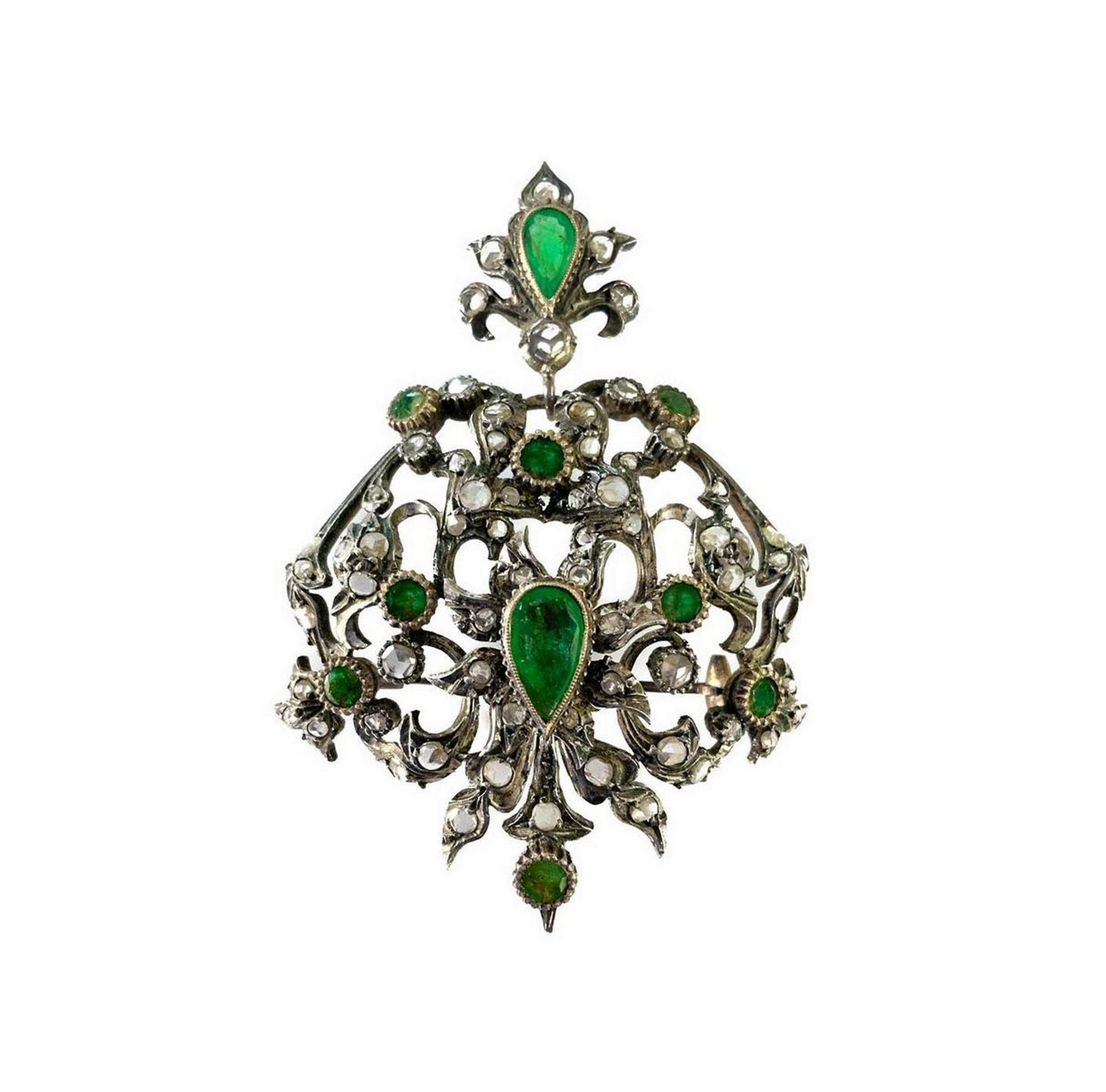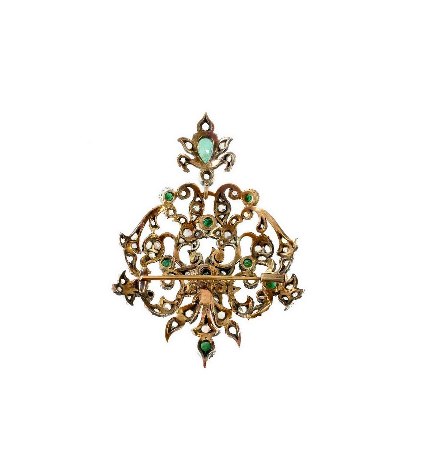Spilla oro basso/arg, gr 22.5 con rosette e smeraldi.