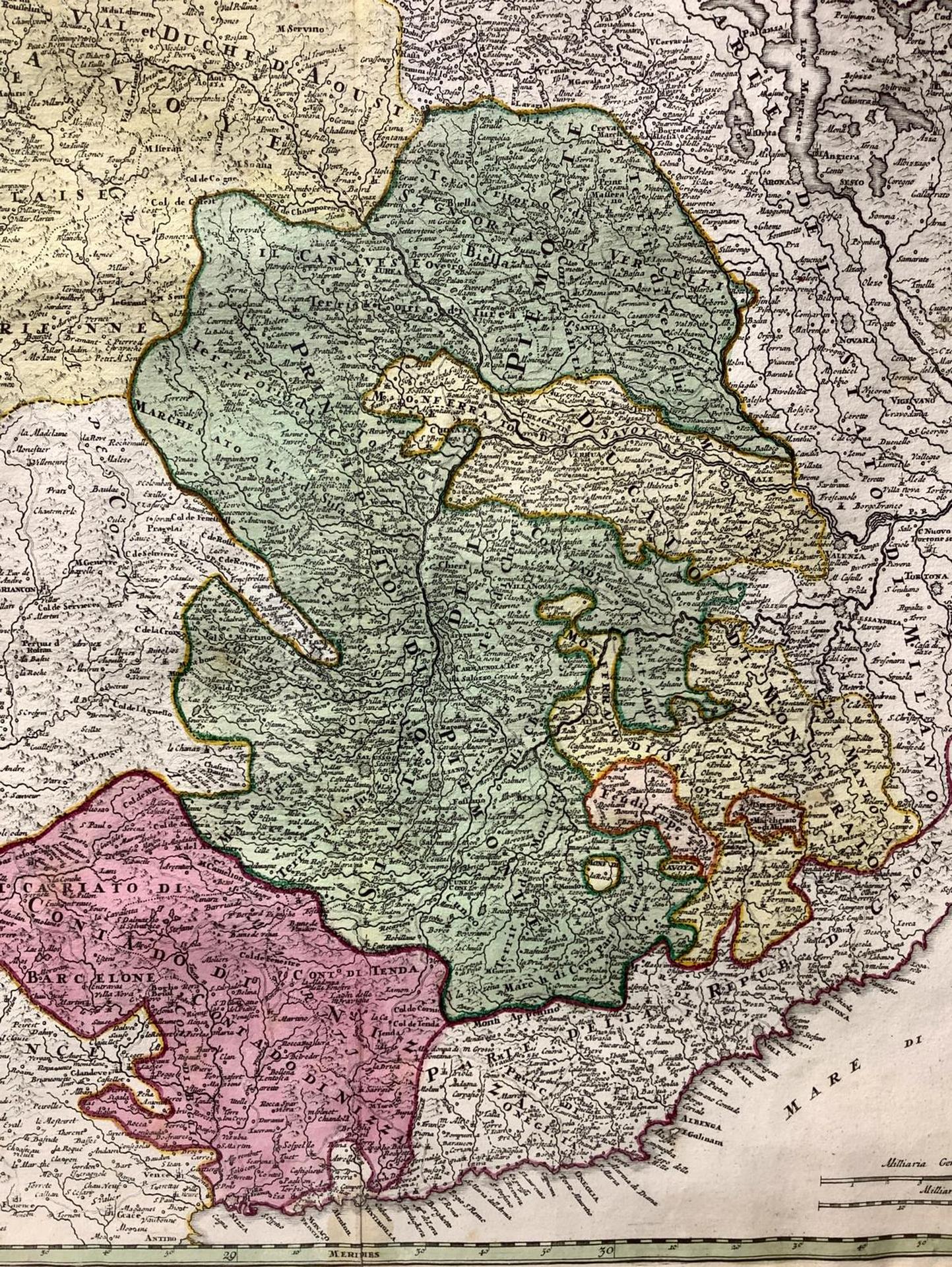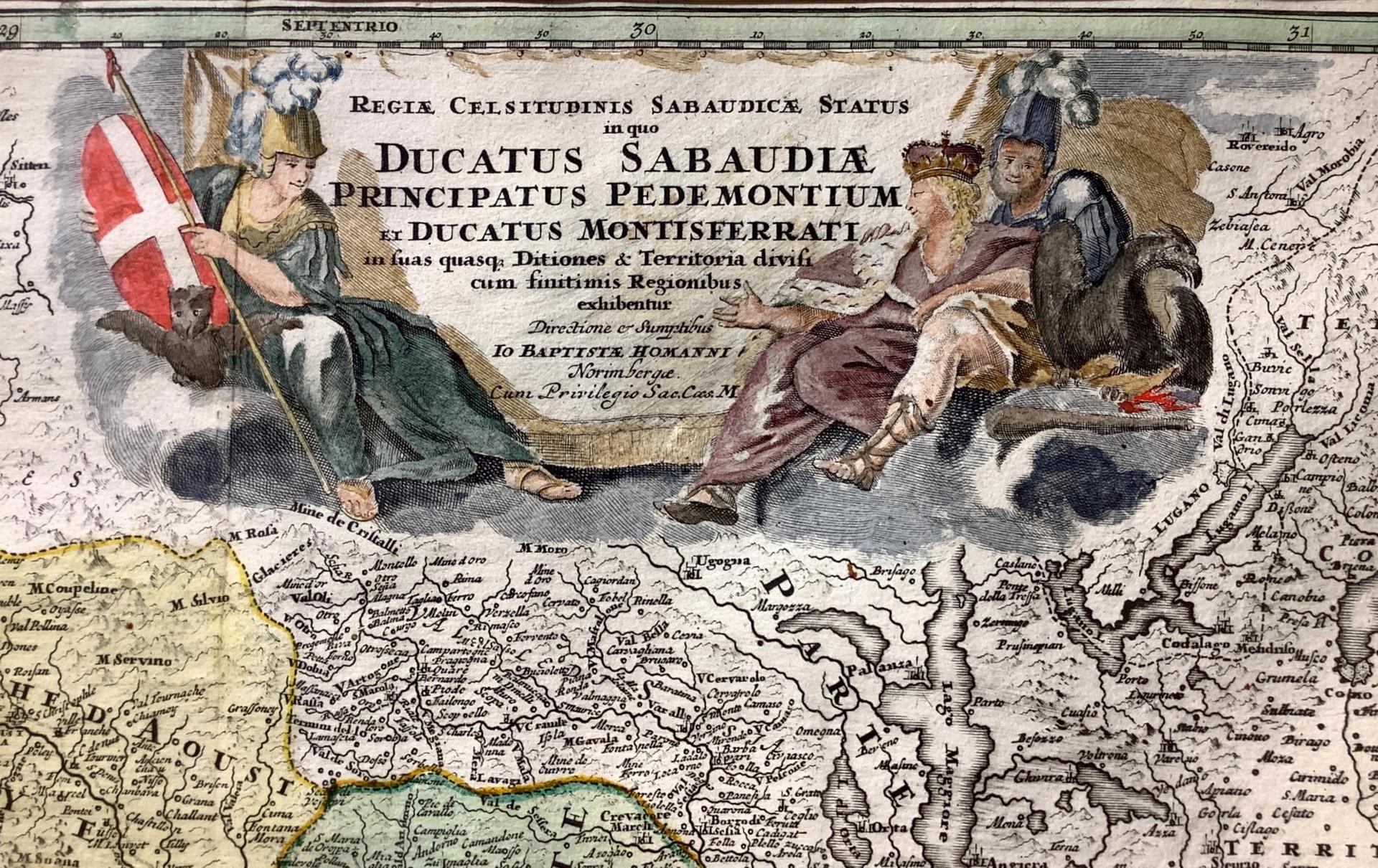 Ducatus Sabaudiae Principatus Pedemontium et Ducatus Montisferratis, incisione acquarellata, C. Weigel (Germania 1712). Ed Joahnn Vaptist Homann (Norimberga 1716). Mm 490x560, in cornice cm 63x70.