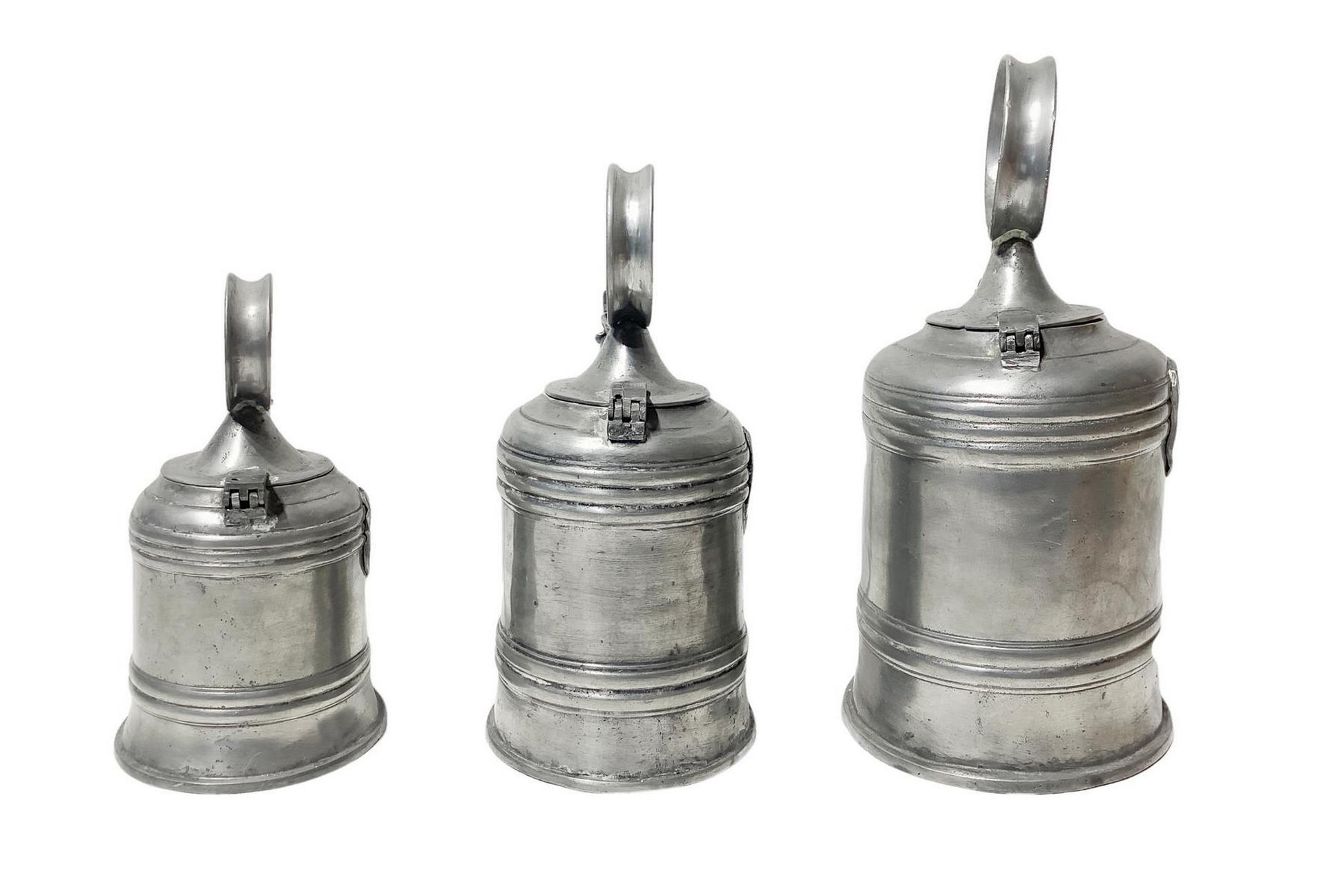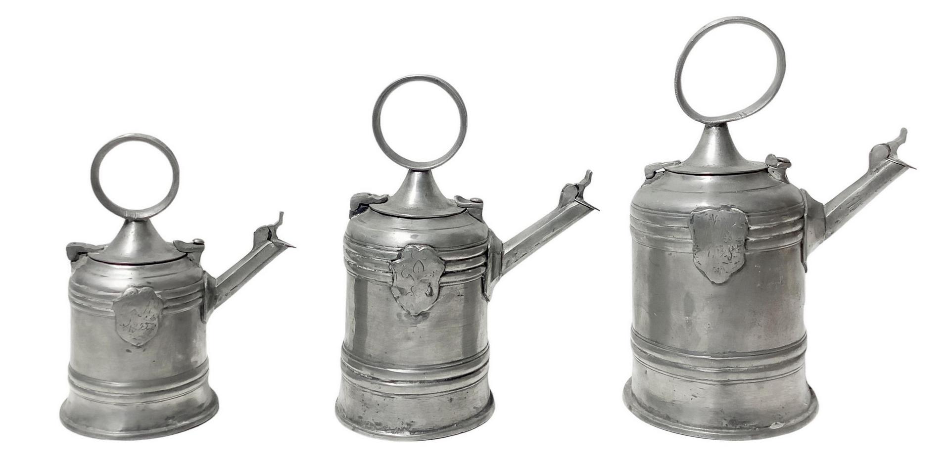 Trittico di antichi versatoi in peltro massiccio 95, XIX secolo. Da...