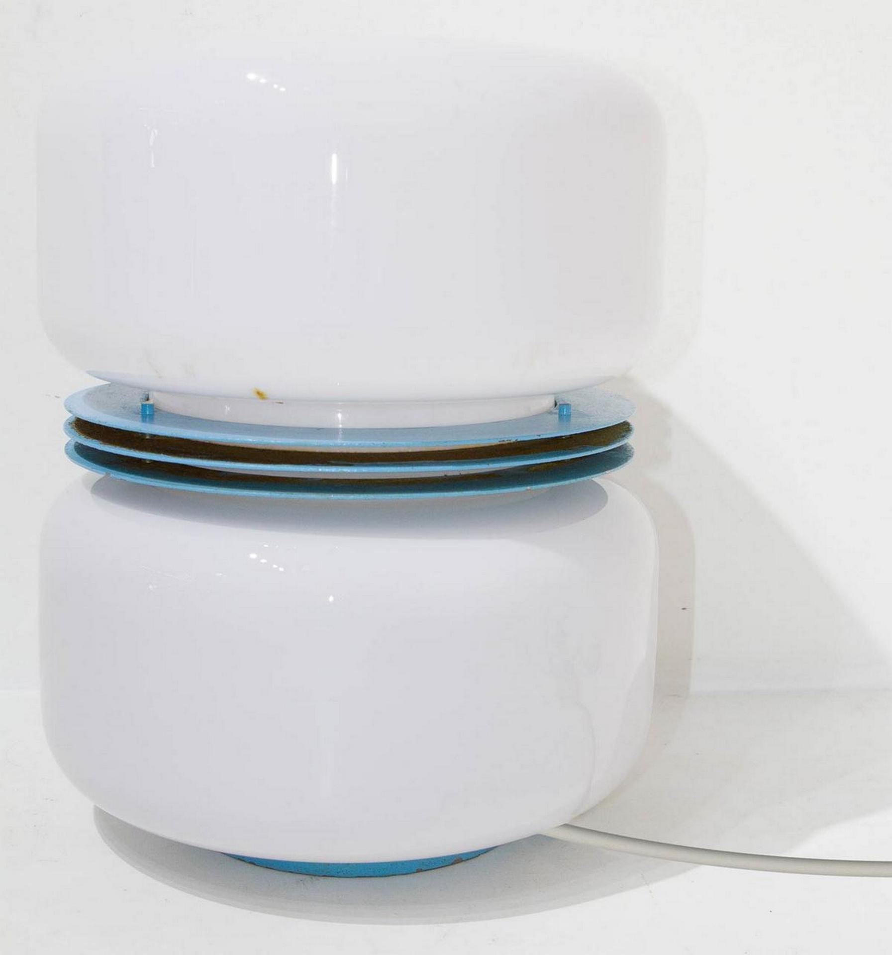 Stilux, lampada da tavolo in vetro e metallo laccato azzurro anni 60. H cm 30, diametro cm 30. Segni d'uso