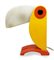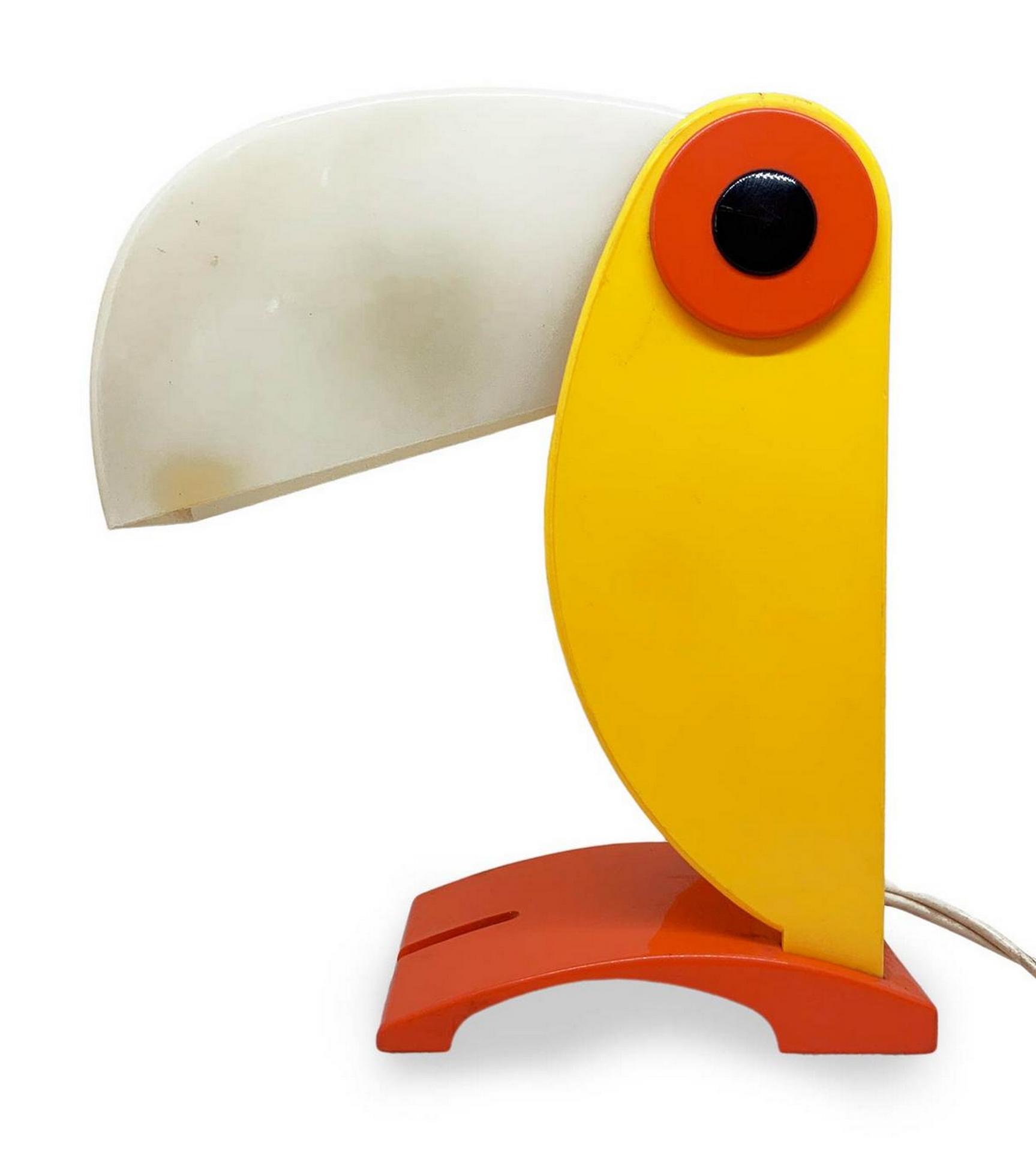 Produzione O.T.F.., lampada da tavolo in plastica policroma raffigurante volatile. Anni 70. Cm 20x7,5x18. Segni di uso, da to be re-electrified.
