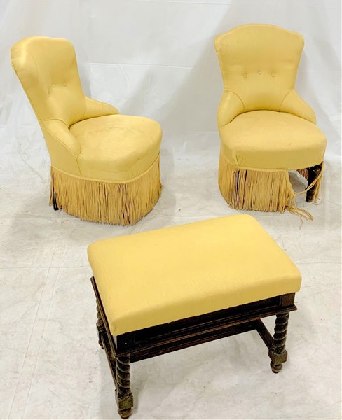 Lotto composto da una coppia di sedie da camera con gambe tornite e rivestite in tessuto giallo, e un panchetto in legno con gambe a torciglione (difetti)