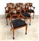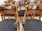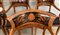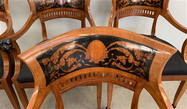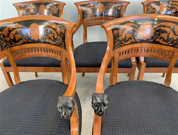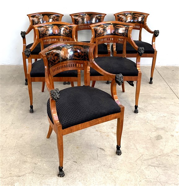 Gruppo di sei poltrone in mogano, cartelle traforate e dipinte a girali fogliate, braccioli terminanti a teste leonine, piedi anteriori ferini
