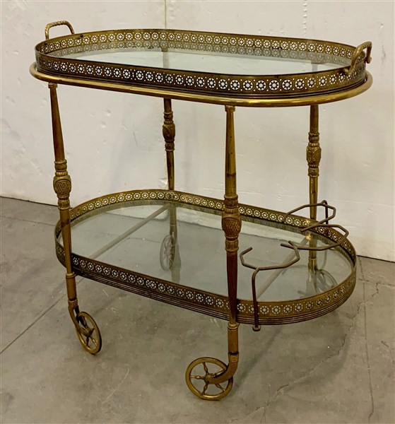 Carrello portavivande in metallo dorato con due ripiani in vetro, di cui quello superiore a vassoio asportabile (cm 75x69x43) (difetti)