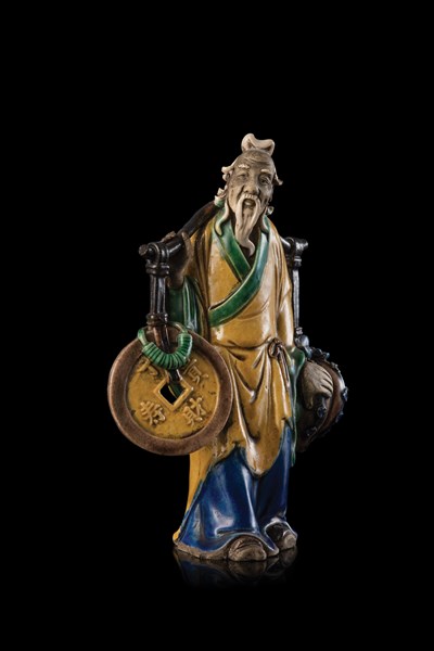 Figura in gres a invetriatura sancai raffigurante un vecchio saggio reggente un giogo con moneta e pesca