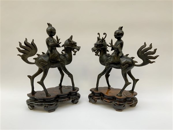 Bronzi raffiguranti fanciulli a dorso di qilin, indossano lunghe vesti e portano oggetti rituali, con basi in legno. Cina, tarda dinastia Ming, sec.XVII