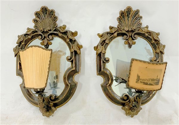 Coppia di ventole a una fiamma con cornici in legno intagliato, laccato e dorat