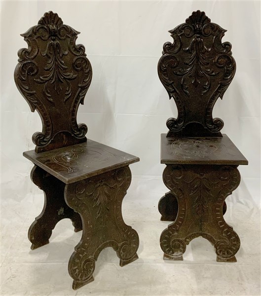 Coppia di scranni neorinascimentali in legno intagliato, fine secolo XIX (difet
