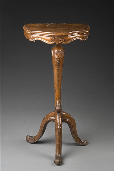 Gueridon in noce con pianetto sagomato, fascia intagliata a volute e foglie, gamba centrale terminante a tre piedi mossi intagliati terminanti a ricciolo. Veneto, sec. XVIII (cm 44x82x27)