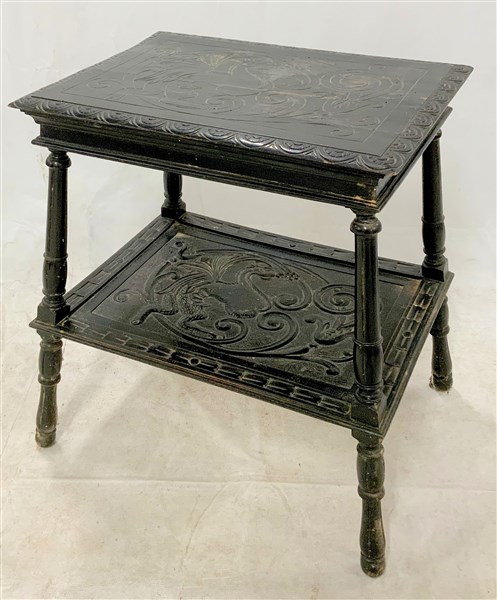 Tavolino di gusto neorinascimentale a due ripiani in legno intagliato ed ebanizzato, con gambe tornite (cm 66x68x48) (difetti)