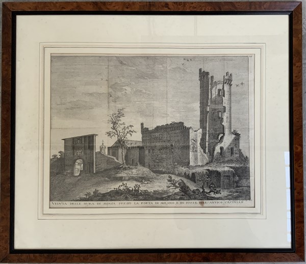 Giulio Cesare Bianchi - "Veduta delle mura di Monza presso la porta di Milano, e di parte dell'antico castello", incisione del secolo XVIII, (battuta cm 37x50 circa), in cornice (difetti)