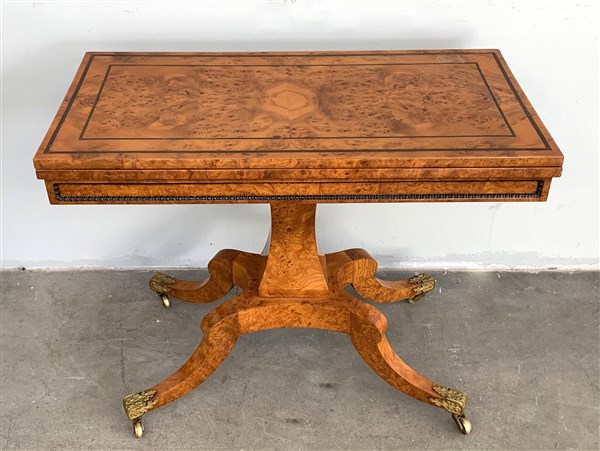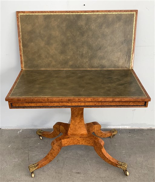 Tavolo da gioco lastronato in acero e profilato in legno ebanizzato. Piano apribile e girevole in pelle impressa in oro. Gambe mosse con scarpette in bronzo cesellato a foglie d'acanto, munite di rotelle (aperto cm 91x71x90) (difetti)