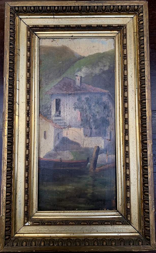 Lot 175 | Ignoto "Casa sul fiume" olio su compensato (cm 40x18) In cornice (difetti)
