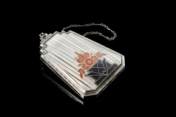 Portacipria in metallo di forma sagomata decorato in smalti a fiori e figure geometriche stilizzate. Marcato Evans (cm 6,5x0,5x9,5) (rotture)
