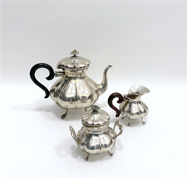 Servizio da the in argento composto da teiera, lattiera e zuccheriera, con corpo decorato a nervature e piedini sagomati terminanti a zampa ferina, prese dei coperchi a forma di fiore, manici della teiera e della lattiera ricurvi in legno (gr 1100 lordi) (difetti)