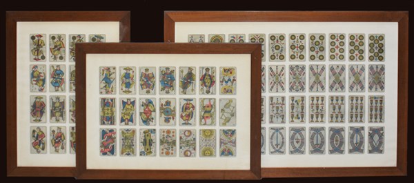 Lotto di tre composizioni in cornici con carte da gioco e tarocchi della ditta R.Pignalosa & Figli di Napoli (lievi difetti)