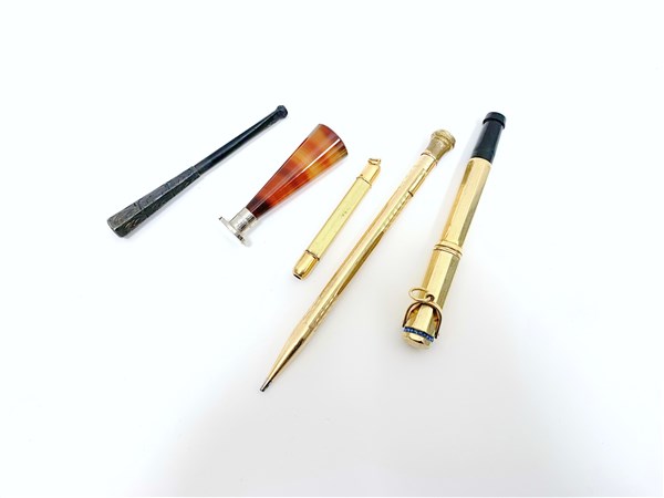 Lotto composto da una penna e due portamine placato oro un bocchino in argento e un sigillo con manico in agata (difetti)