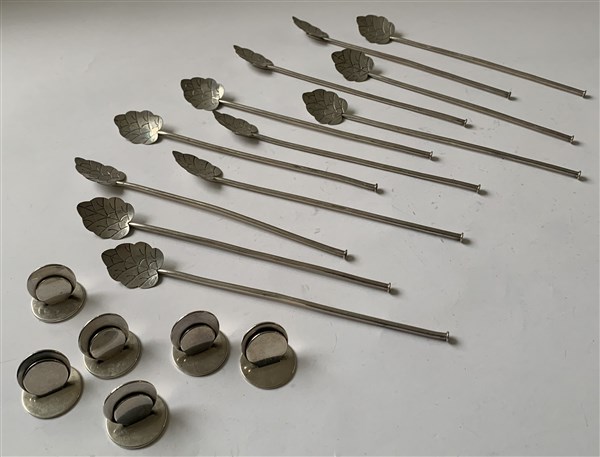 Lotto composto da sei segnaposto in argento con punzoni inglesi di Newcastle? (g 120)uniti a dodici palette per mescere decorate a foglia e marcate Mexico sterling (g 150)