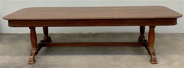 Grande tavolo da centro in legno con sostegni torniti uniti da traverse sagomate (cm 300x80x125) (difetti)