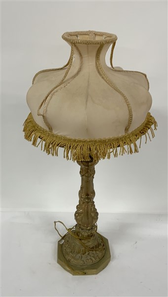 Lampada da tavolo in metallo dorato e cesellato a volute, motivi vegetali e fiori (h cm 50) paralume in stoffa (difetti)