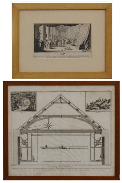 Lotto composto da due incisioni: Sébastien Leclerc I "Colbert visita la galleria di arazzi di Gobelins " e R. Benard "Machines de Theatres" da l'Encyclopédie di Diderot (misure diverse). In cornici