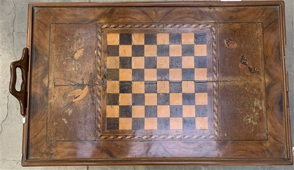 Tavolino da gioco con piano a vassoio biansato asportabile intarsiato a scacchiera, farfalle e uccellino, base con gambe rastremate (cm 77x48x509 (difetti e mancanze)