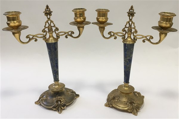 Coppia di candelabri a due fiamme con base in argento dorato e decorato a rocaille con fusto in sodalite. Argentiere Bartolini e Bartolozzi, Firenze seconda metà del secolo XX (h cm 22)(difetti)