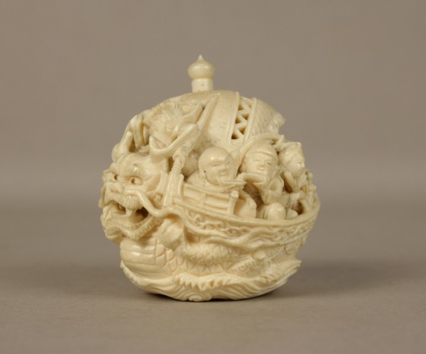 Importante netsuke in avorio raff. ''BARCA CON PERSONAGGI''. Cina. Fine XIX secolo. Mis. Alt. cm. 6 Diam. cm. 5,5 ca.