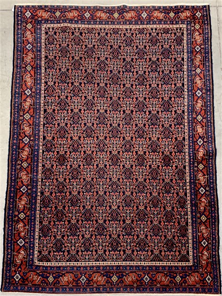 Tappeto Senneh, Persia, secolo XX. Decoro Herati su fondo blu. Bordura Herati su fondo rosso. (cm 196x134) (Lievi difetti)