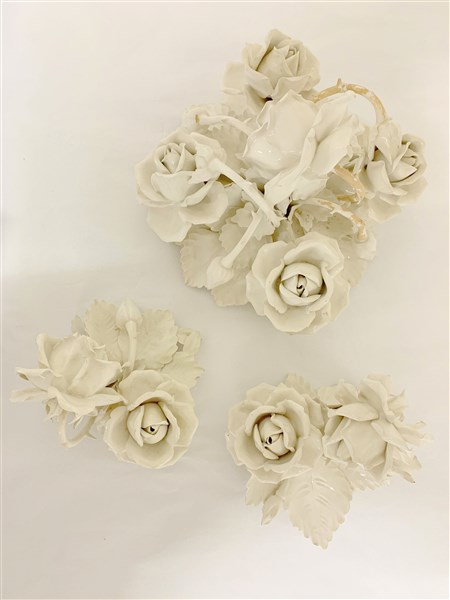 Gruppo di tre centrotavola in ceramica bianca a forma di mazzi di rose a tutto
