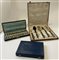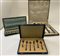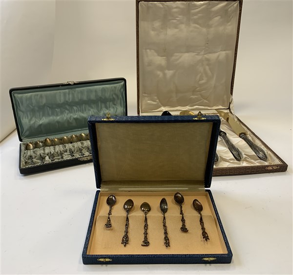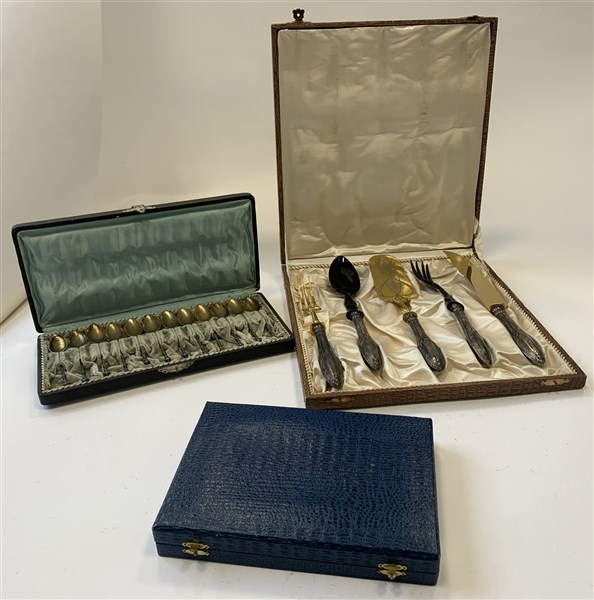 Lotto composto da un servizio di posate a servire in argento e vermeille, un set da dodici cucchiaini da caffè in argento con punzoni tedeschi e sei cucchiaini in metallo decorati a simboli romani. In tre custodie (difetti)