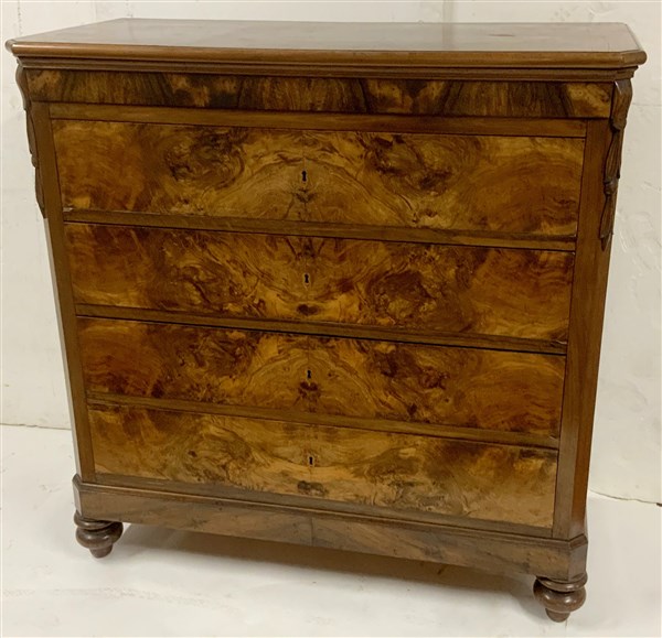 Cassettone a quattro cassetti e mezzo lastronati in radica. Piedi anteriori a cipolla (cm 127x129x57) (difetti)