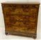 Cassettone a quattro cassetti e mezzo lastronati in radica. Piedi anteriori a c