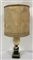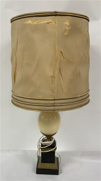 Lampada da tavolo con base a plinto in marmo nero e bronzo dorato che sorregge un uovo di struzzo (h cm 42) paralume in stoffa (difetti)