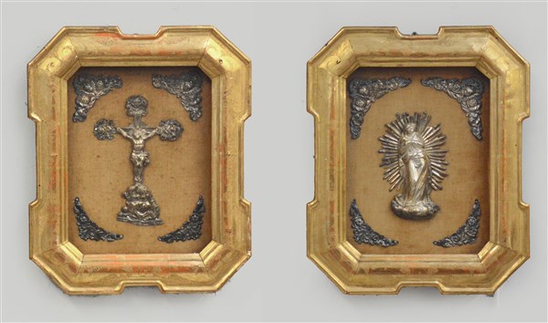 Coppia di pannelli decorativi realizzati con elementi antichi in metallo sbalzato e argentato raffiguranti l'Immacolata e Cristo in croce, in cornice. Secolo XIX (cm tot 43x36)