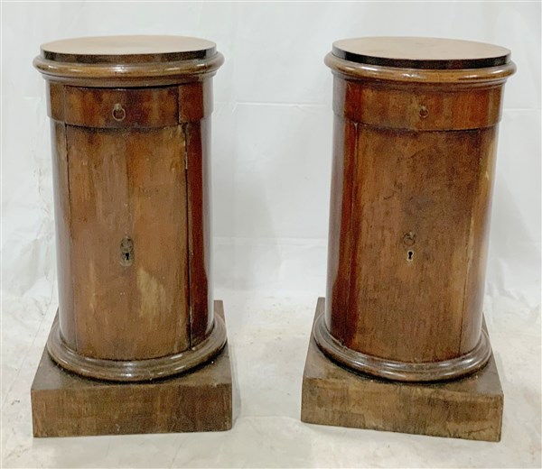 Coppia di comodini a colonna di forma tonda ad un cassetto ed un'anta poggiante su base squadrata e lastronata. Secolo XIX (cm 39x75x39) (difetti)