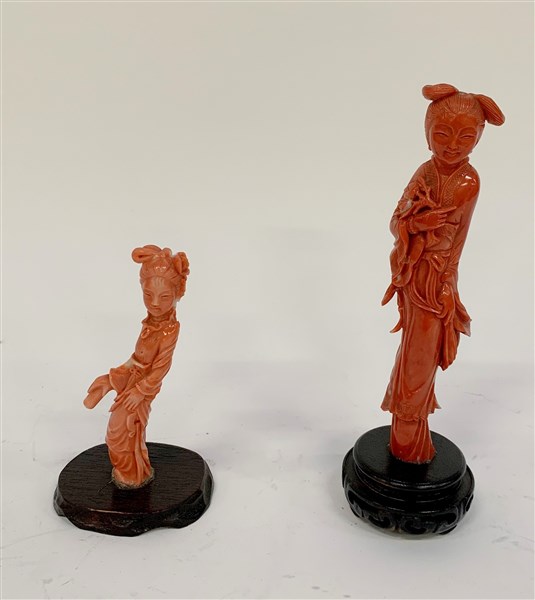 Due sculture in corallo rosso. Cina, inizio secolo XX (h cm 18)(g.lordi 227 c.a.)