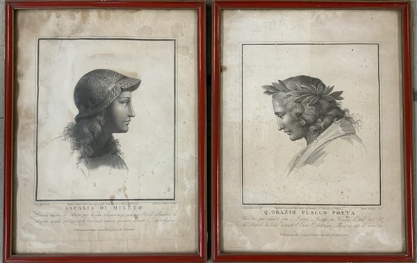 Lotto composto da quattro antiche incisioni colorate a soggetto ornitologico, ed una coppia di incisioni con ritratti di personaggi del mondo classico, in cornici (difetti)