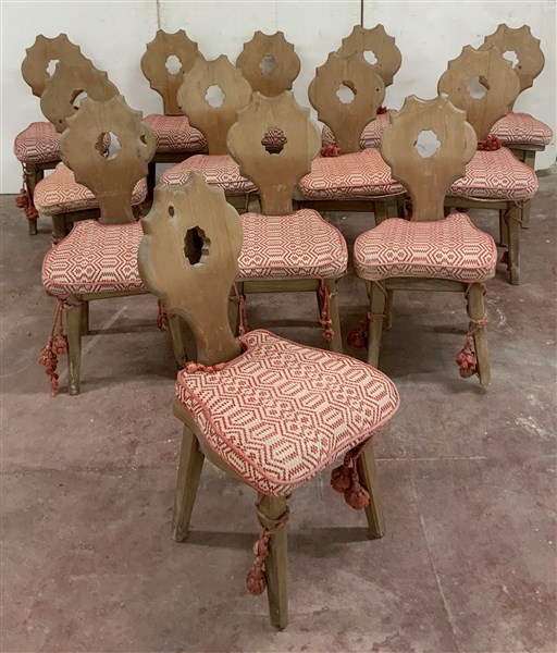 Gruppo di tredici seggioline rustiche in legno con schienale sagomato e trafora