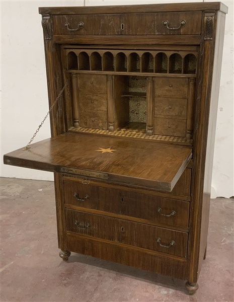 Secretaire in legno a quattro cassetti e anta ribaltabile celante scarabattolo di struttura architettonica a sei cassettini con vani e segreti piano intarsiato a marquetterie, piedi torniti, secolo XIX (cm 86x148x40) (difetti e mancanze)