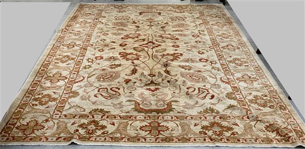 Tappeto Azeri, Caucaso, Secolo XX. Replica di un decoro persiano safavide con ampi rami fioriti nei toni del rosso, marrone, nocciola, rosa, beige e verde oliva su fondo panna. (Difetti, macchie) (cm 527x375)