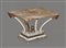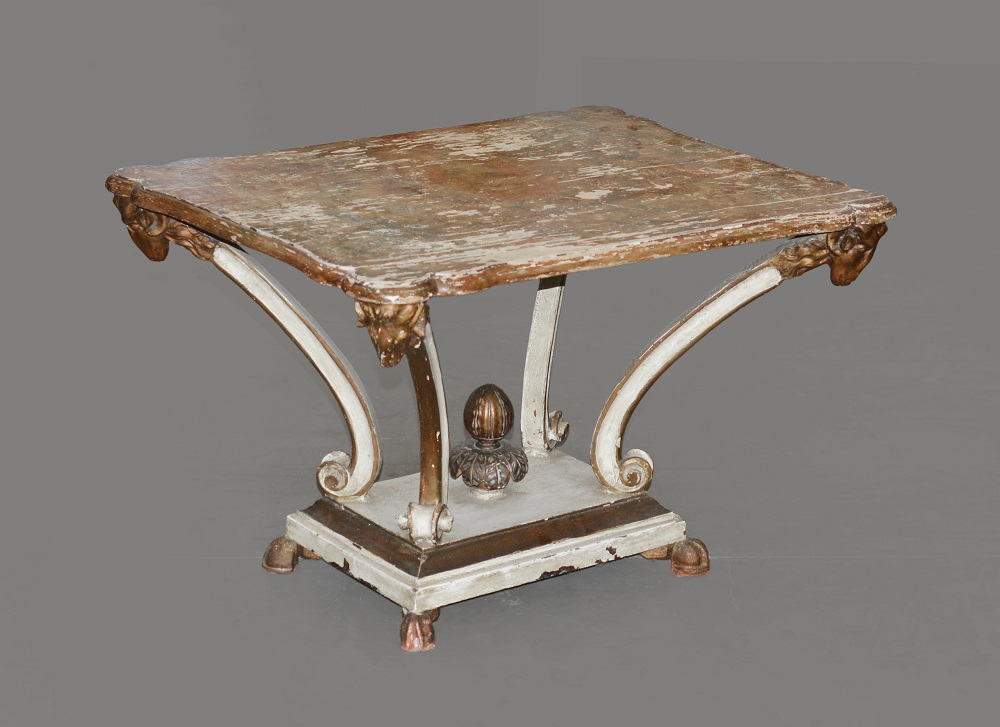 Tavolino da salotto in legno laccato e dorato, montanti curvi terminanti con teste caprine riunite da pianetto decorato al centro da pigna a tutto tondo, piedi a zampa caprina (cm 83x54x65) (difetti)